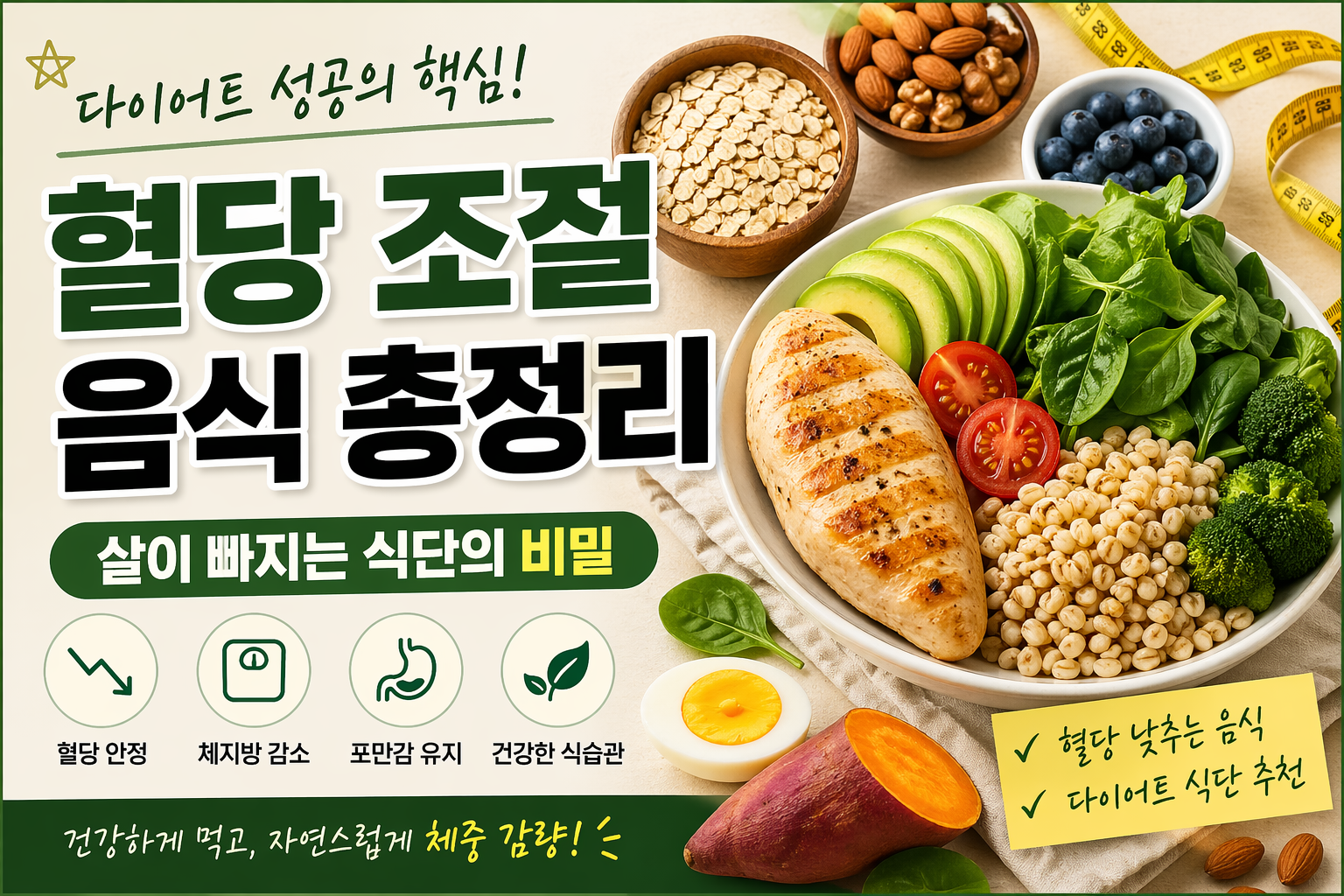 무엇보다 중요한 것은 “빨리 빼는 것”이 아니라 다시 찌지 않는 몸을 만드는 것입니다. 혈당 조절 식단은 바로 그 핵심 방법 중 하나입니다.