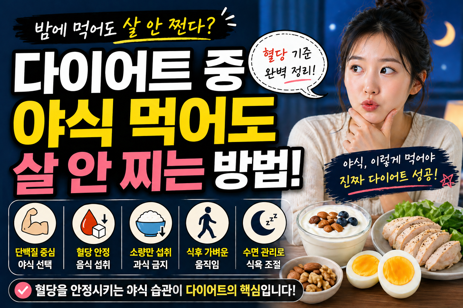 중요한 것은 야식을 먹느냐가 아니라, 어떤 선택을 하느냐입니다. 혈당을 안정적으로 유지하는 방식으로 야식을 구성한다면, 체중 증가를 최소화하면서도 충분한 만족감을 얻을 수 있습니다.
